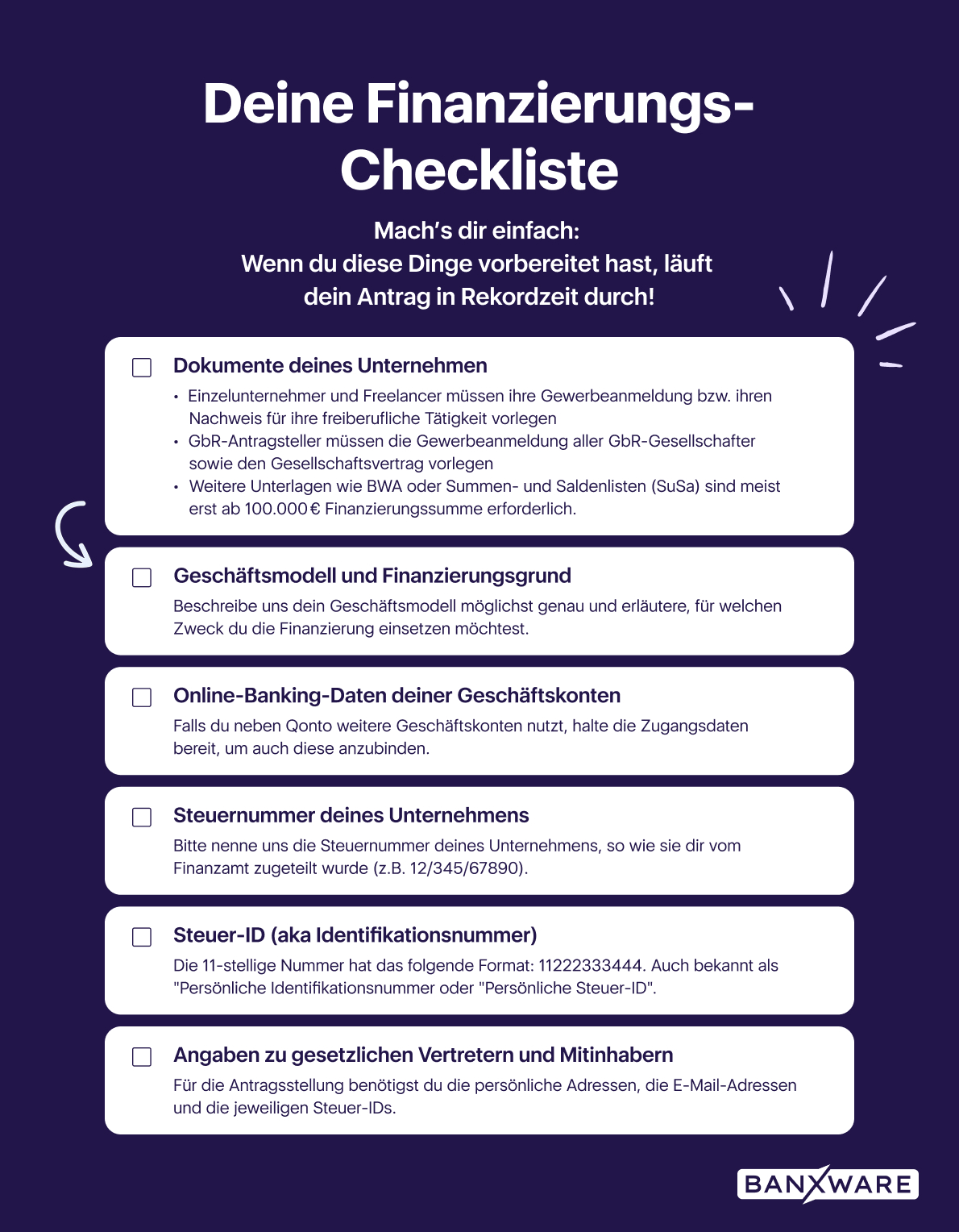 The better prepared you are, the faster you’ll receive your financing. And with us, we really mean fast: the application for the Banxware Sofortfinanzierung takes just about 15 minutes: fully digital, no paperwork, and easily done from your laptop.